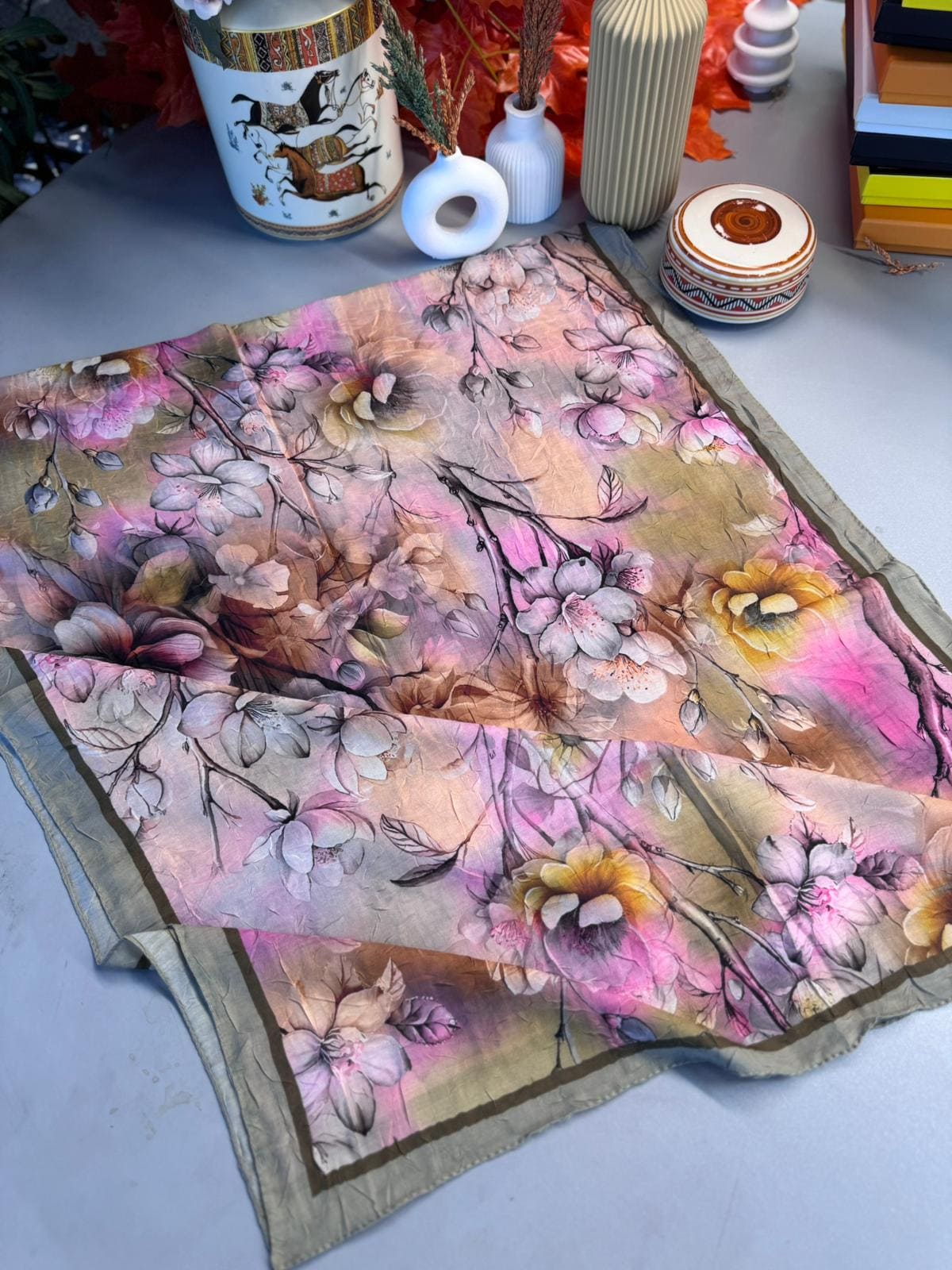 Zarafeti ve şıklığı bir arada sunan bu şal, modern çizgilerle klasik desenlerin mükemmel birleşimini yansıtıyor.