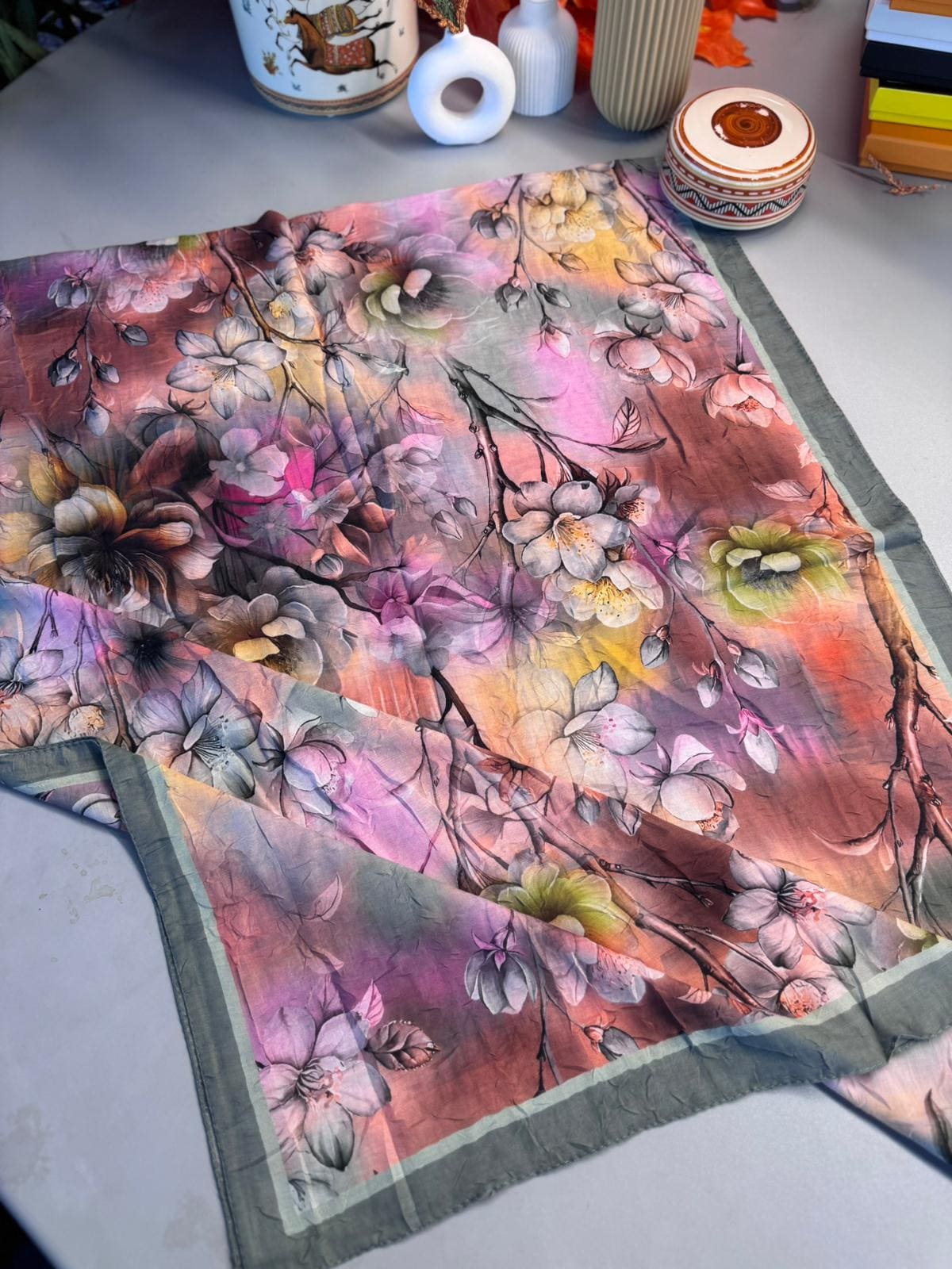 Zarafeti ve şıklığı bir arada sunan bu şal, modern çizgilerle klasik desenlerin mükemmel birleşimini yansıtıyor.