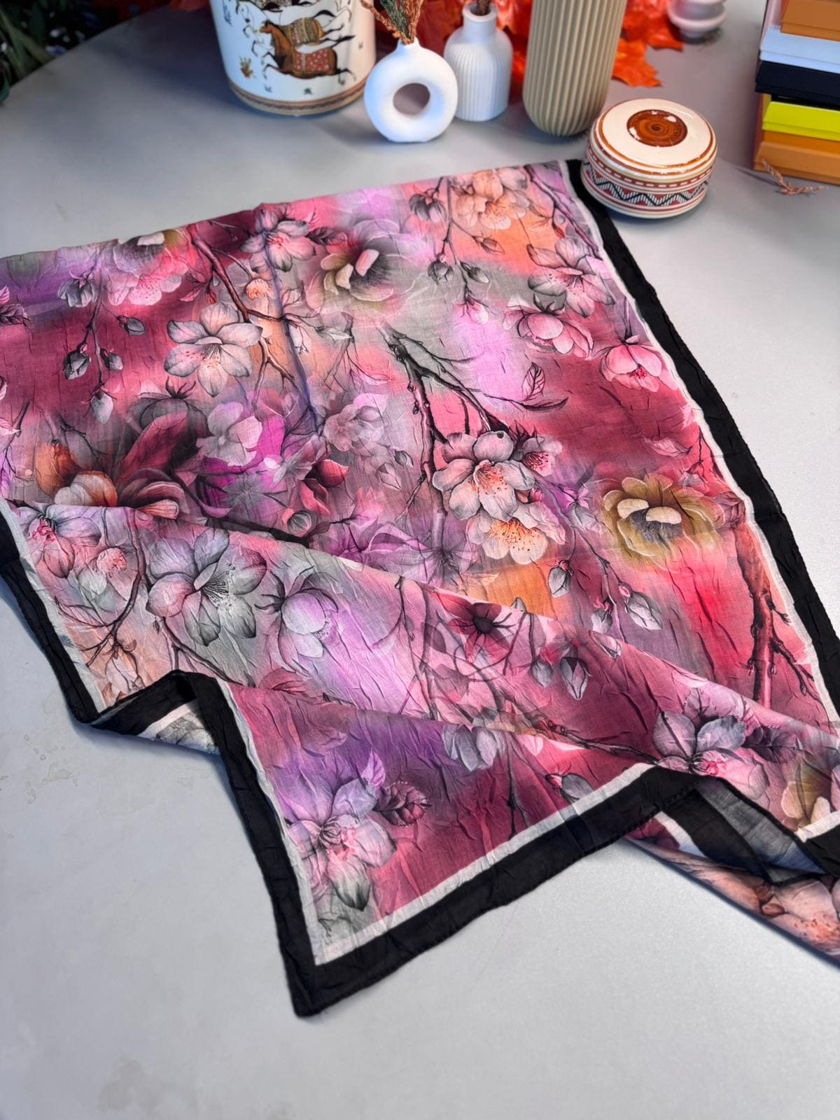Zarafeti ve şıklığı bir arada sunan bu şal, modern çizgilerle klasik desenlerin mükemmel birleşimini yansıtıyor.