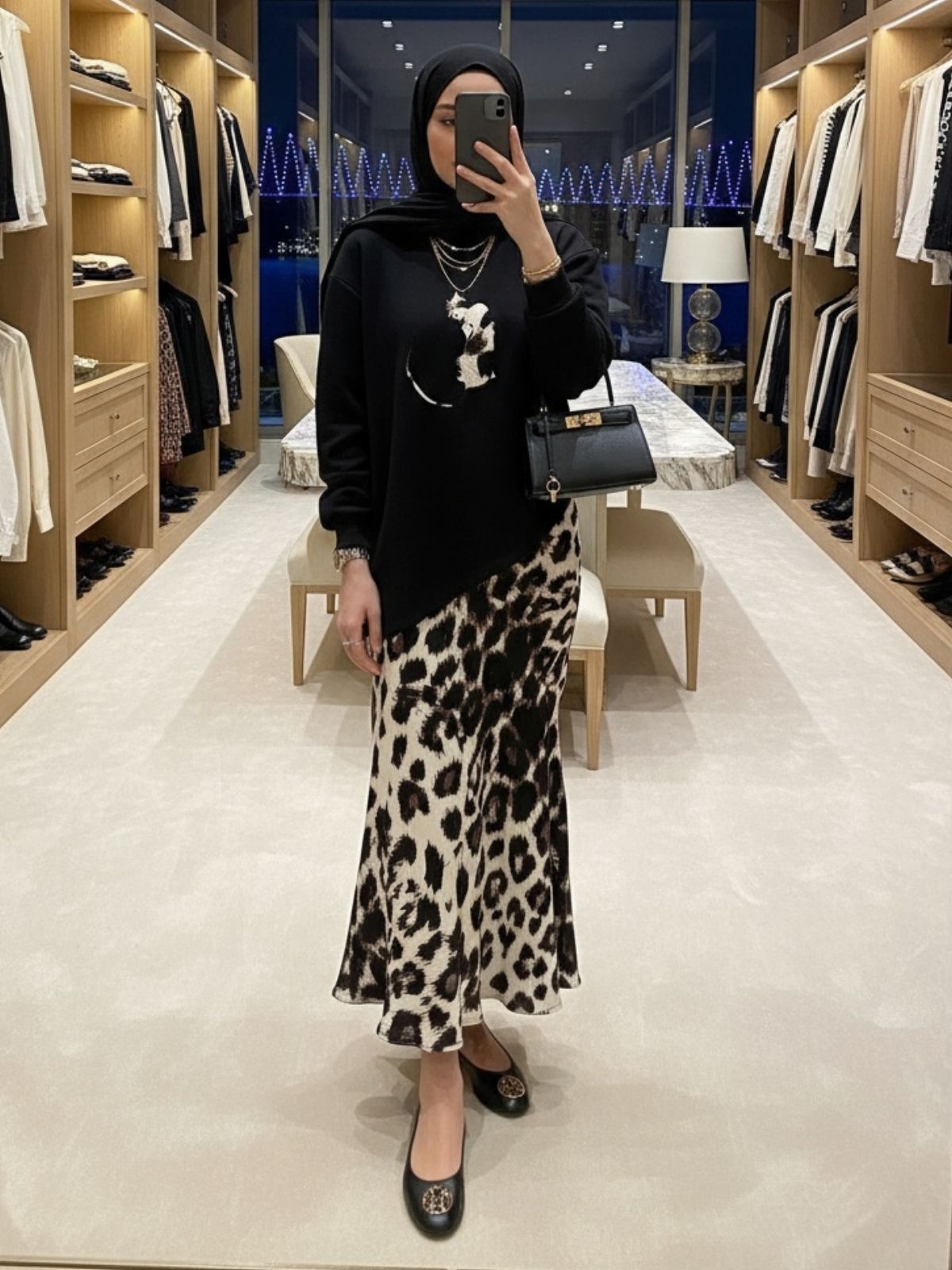 Trendleri yakalayın! Bu modern kombin, siyah, salaş sweatshirt ve dökümlü leopar desenli midi eteği bir araya getiriyor.