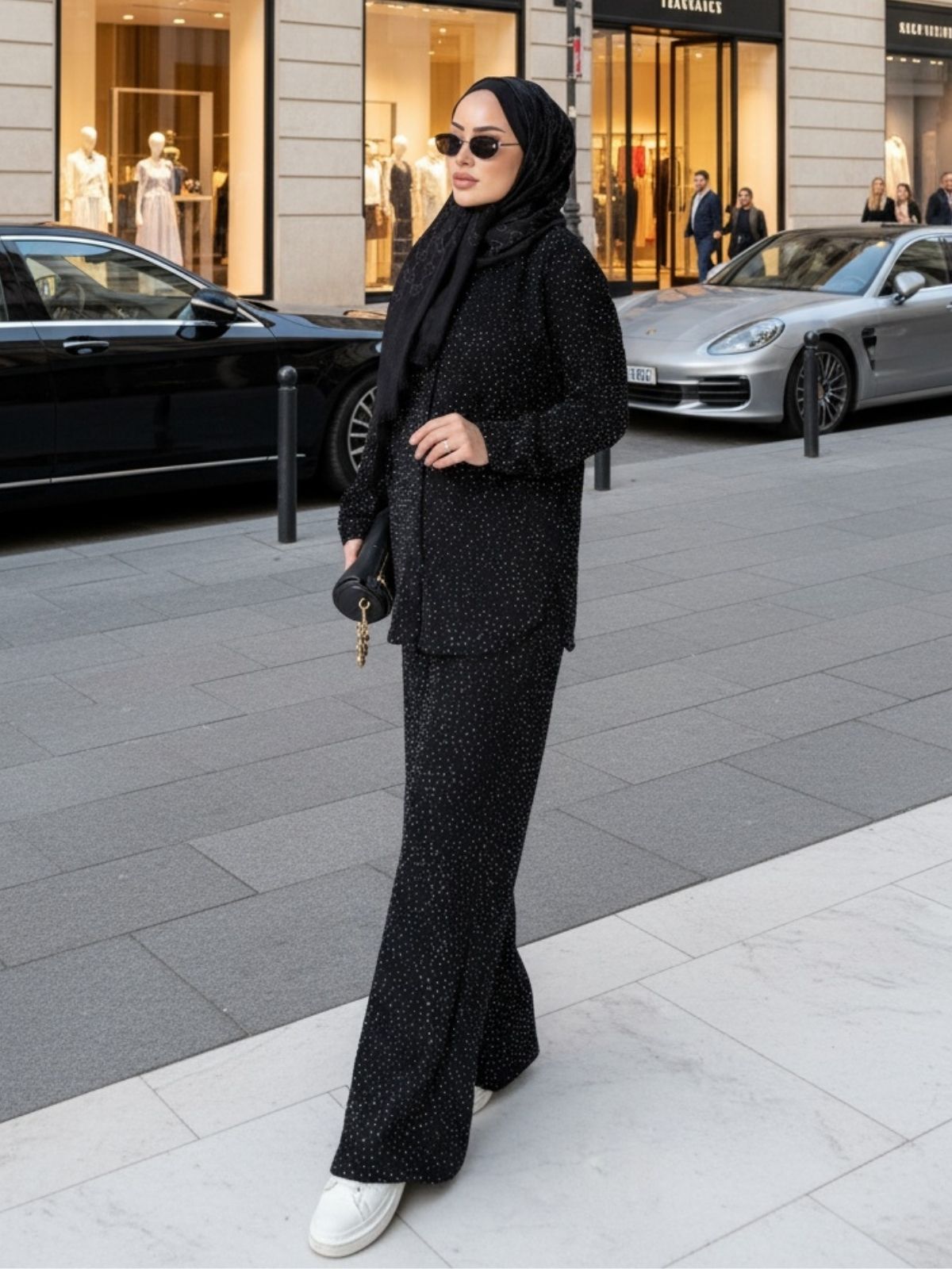 Kullanım Alanı: Bu takım, spor ayakkabılarla kombinlenerek günlük şıklıkta, topuklu ayakkabılar ve zincir detaylı bir çanta ile tamamlanarak özel akşam etkinliklerinde veya davetlerde rahatlıkla kullanılabilir.
