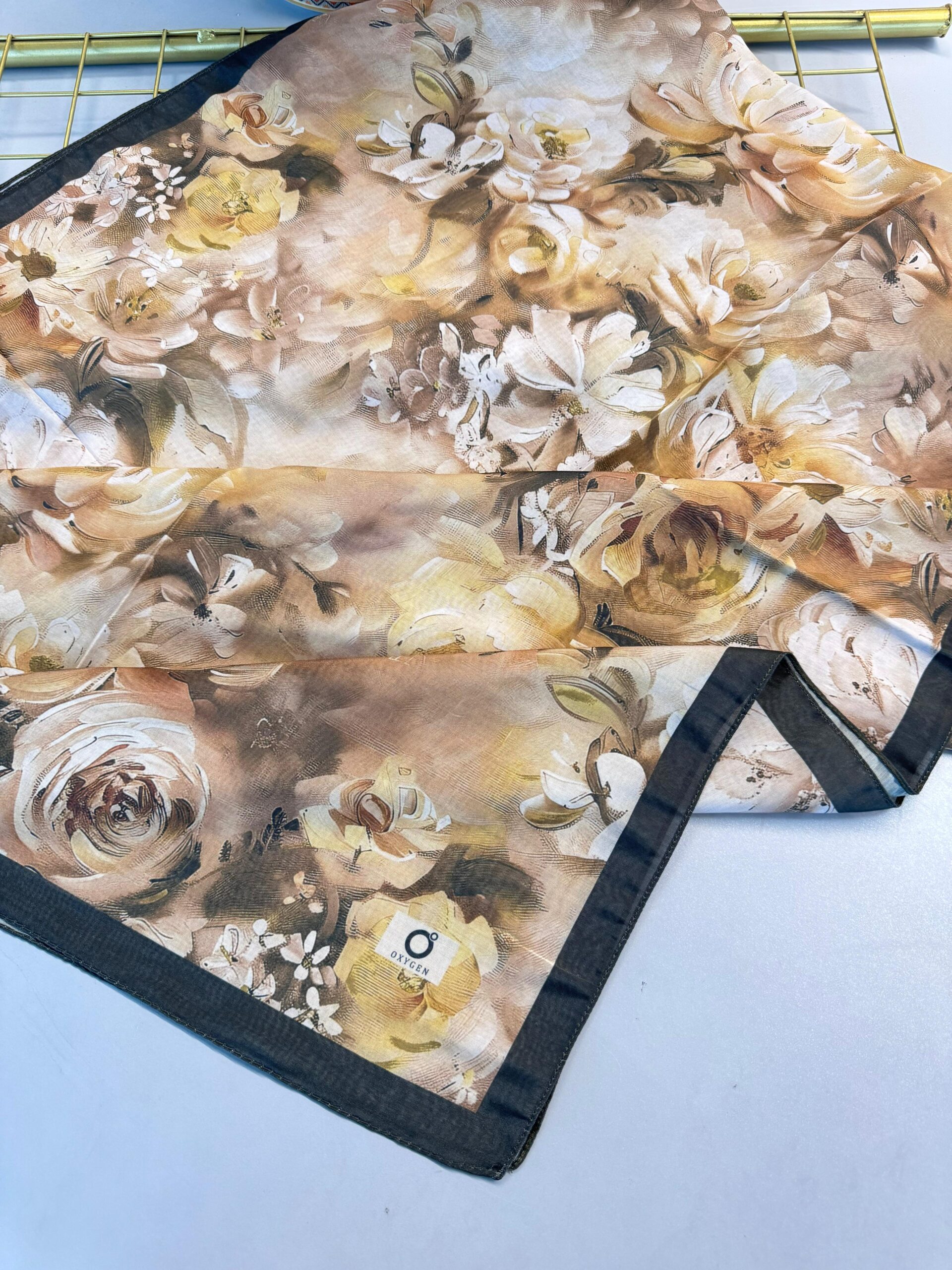 Doğanın zarif çiçeklerini, kahve ve bronzun büyüleyici sıcak tonlarıyla buluşturan Mystic Bloom Desen Pamuk İpek Şal, romantik ve sofistike bir stilin anahtar parçası. Sanatsal fırça darbelerini andıran floral deseniyle, her detayıyla göz alıcı.