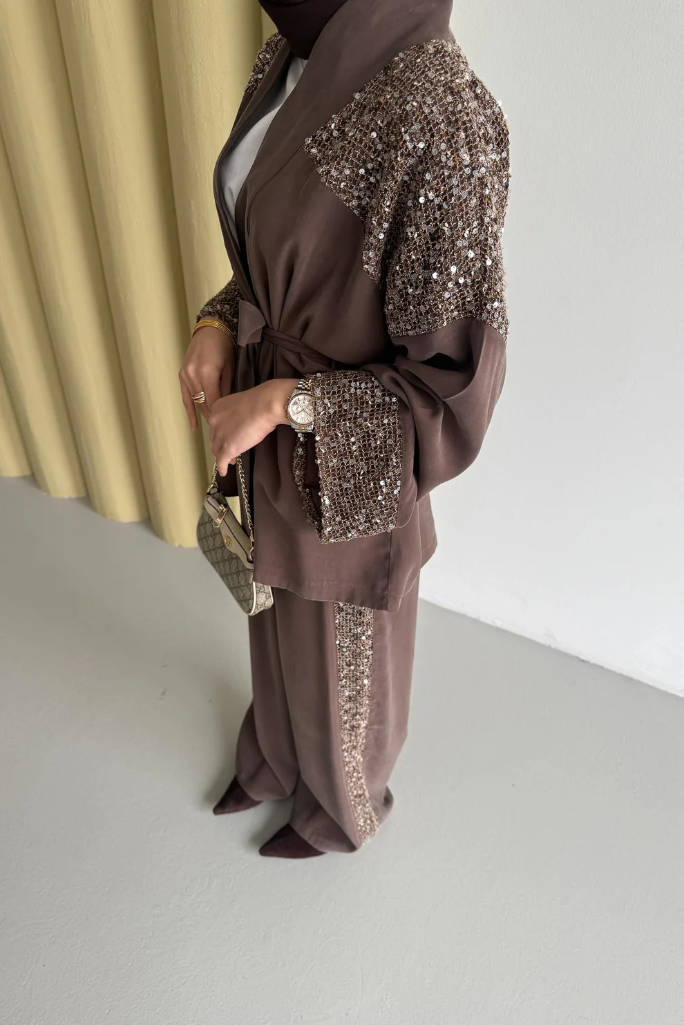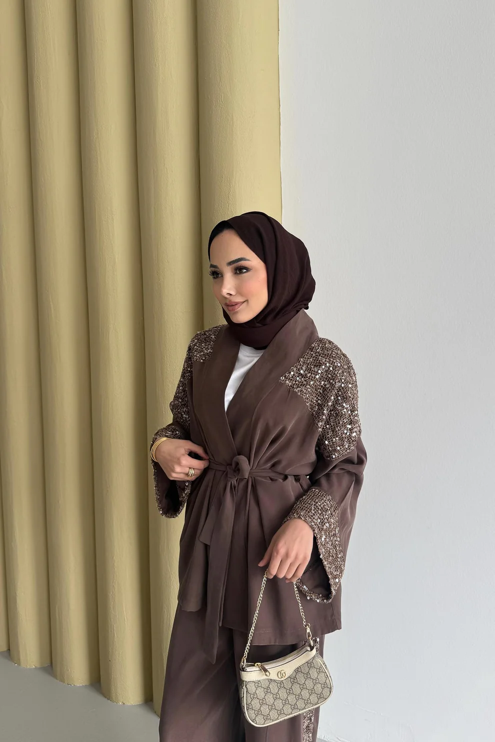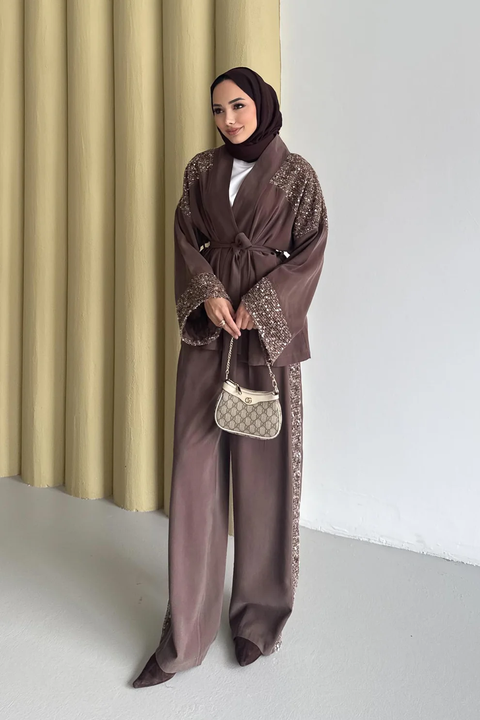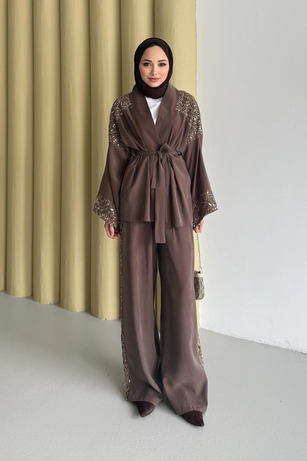 Tunik omuzları ve Kol ucu Payet dokumadır, ortalama 70 cm, seyyar kuşaklıdır. Pantolon Palazzo formdadır, oldukça rahattır, Beli lastiklidir.