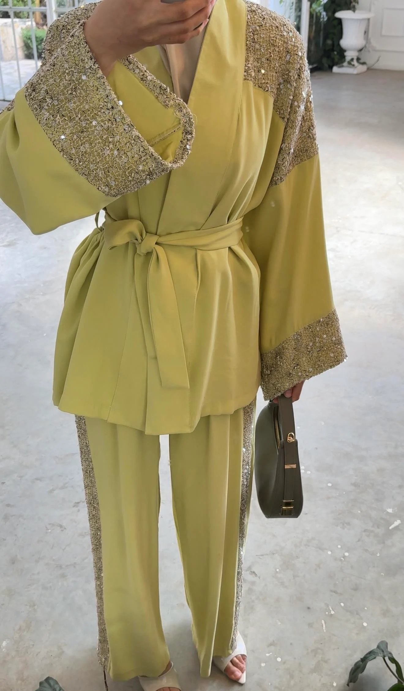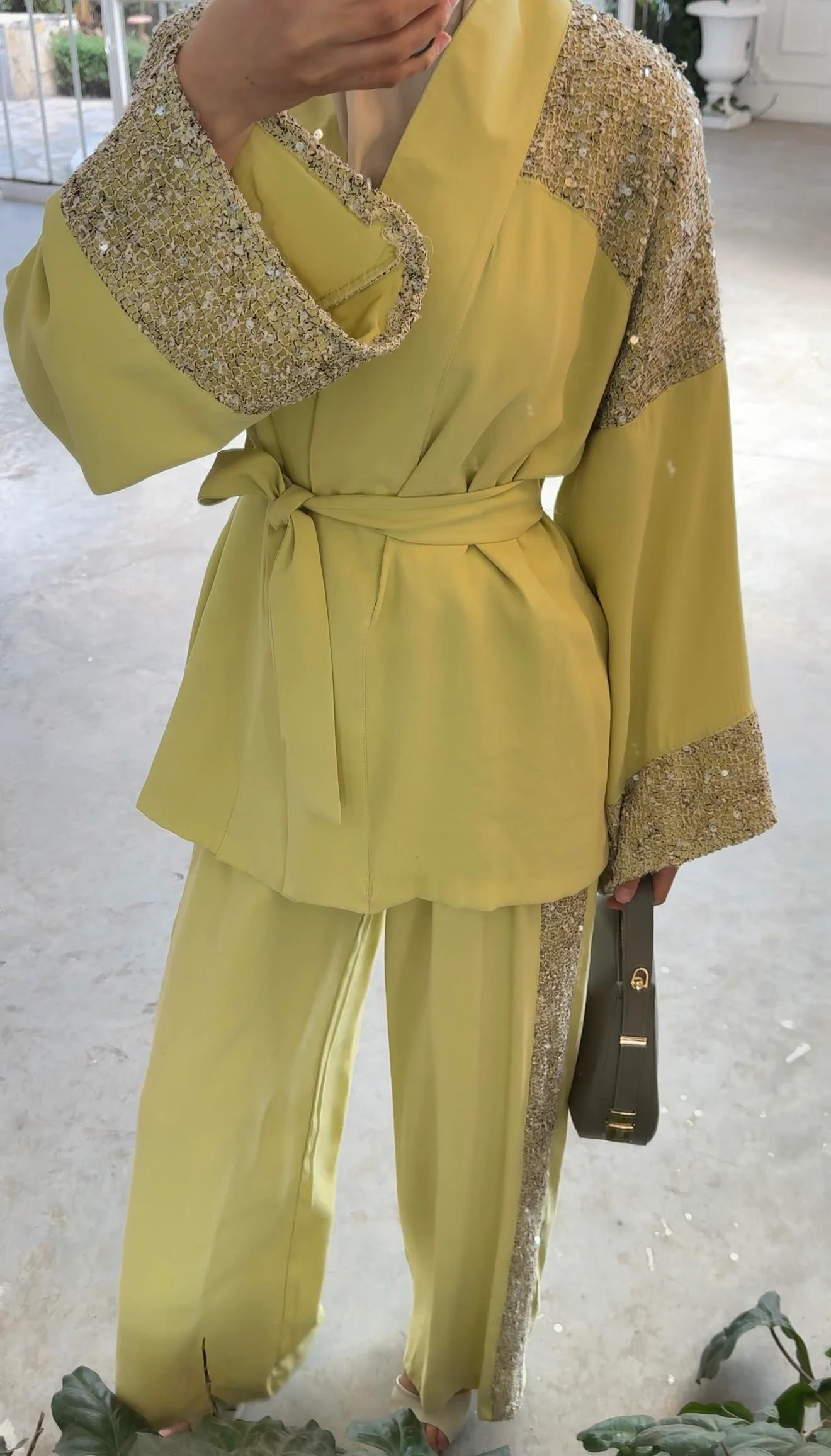 Tunik omuzları ve Kol ucu Payet dokumadır, ortalama 70 cm, seyyar kuşaklıdır. Pantolon Palazzo formdadır, oldukça rahattır, Beli lastiklidir.