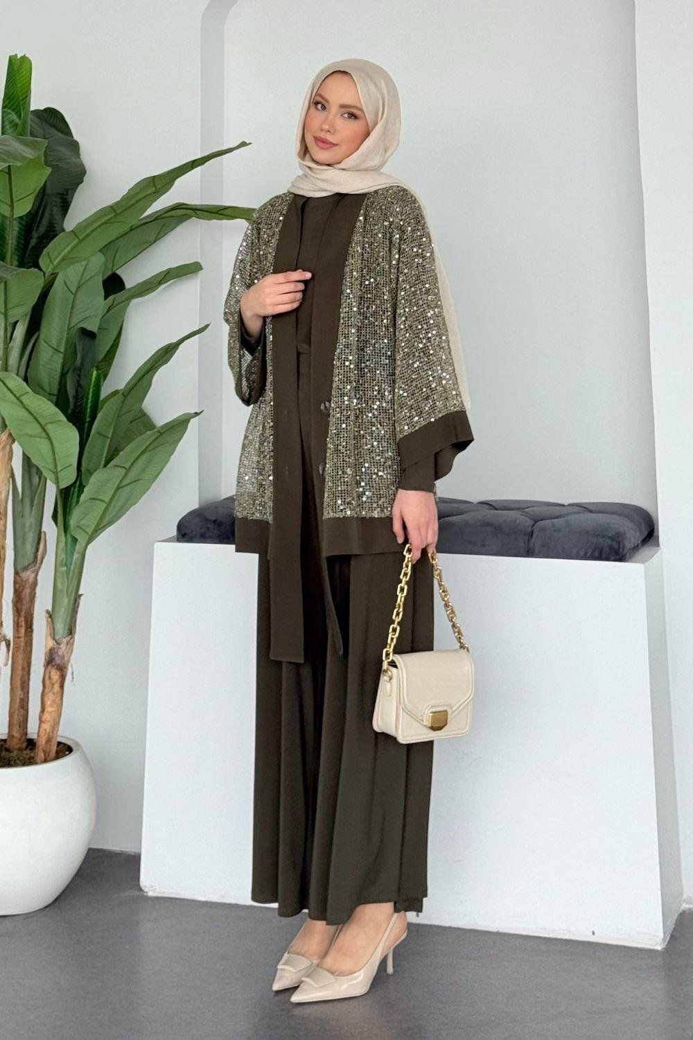 Üçlü takımdan oluşmaktadır: ceket,bluz ve pantolon.