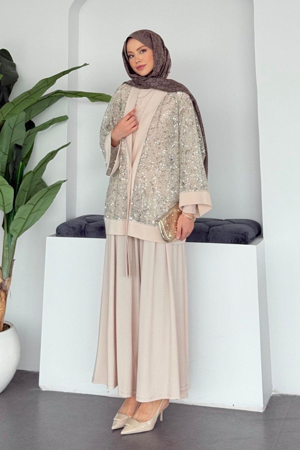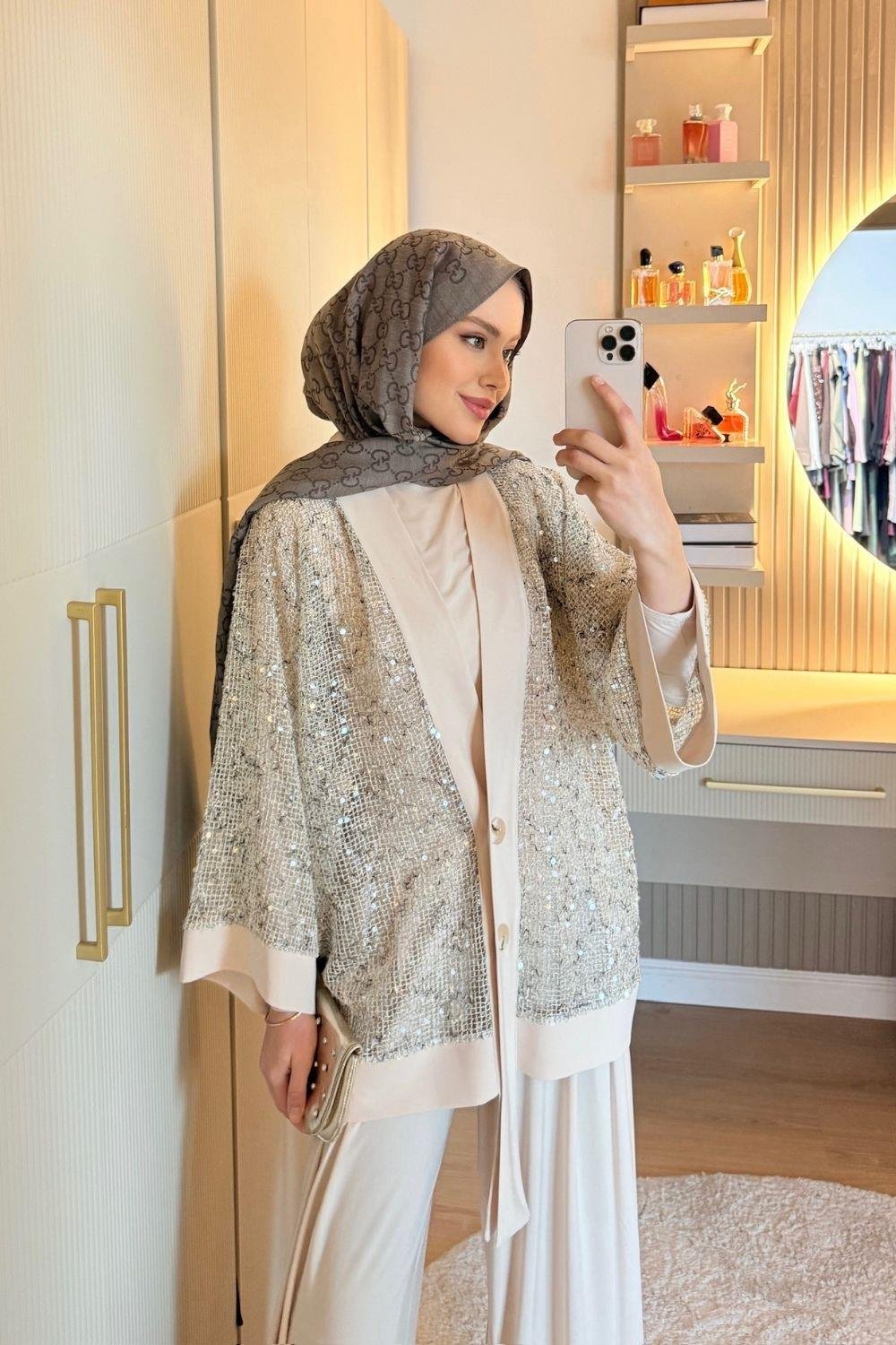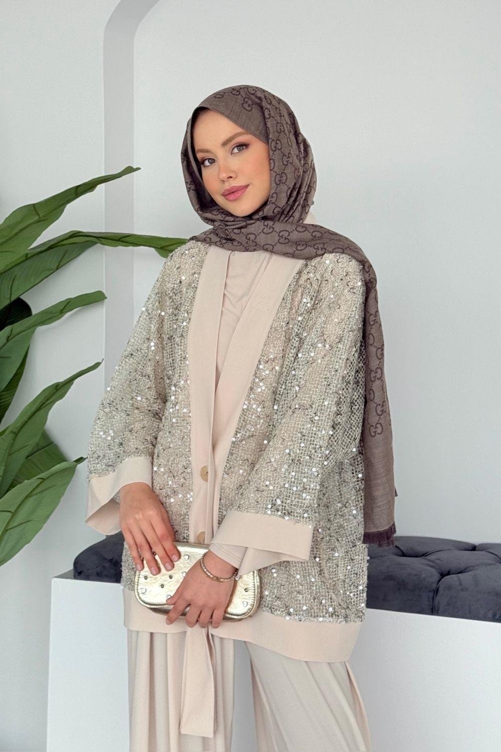Ceket payet detaylıdır ve önden düğmelidir