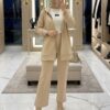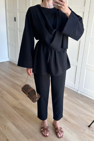 Hem günlük şıklıkta hem özel davetlerde rahatlıkla tercih edilebilecek bu takım, modern zarafeti geleneksel dokunuşlarla buluşturuyor.