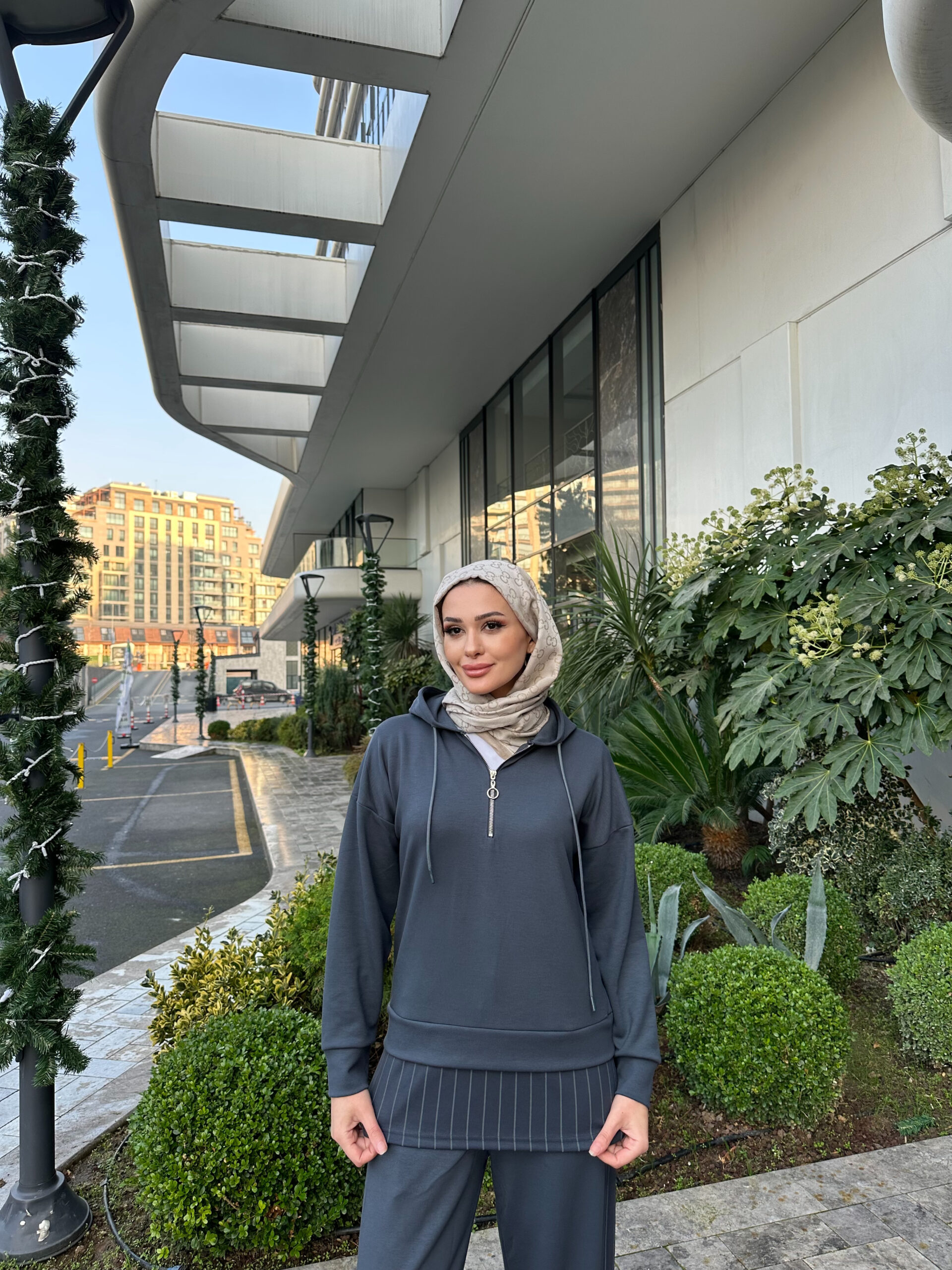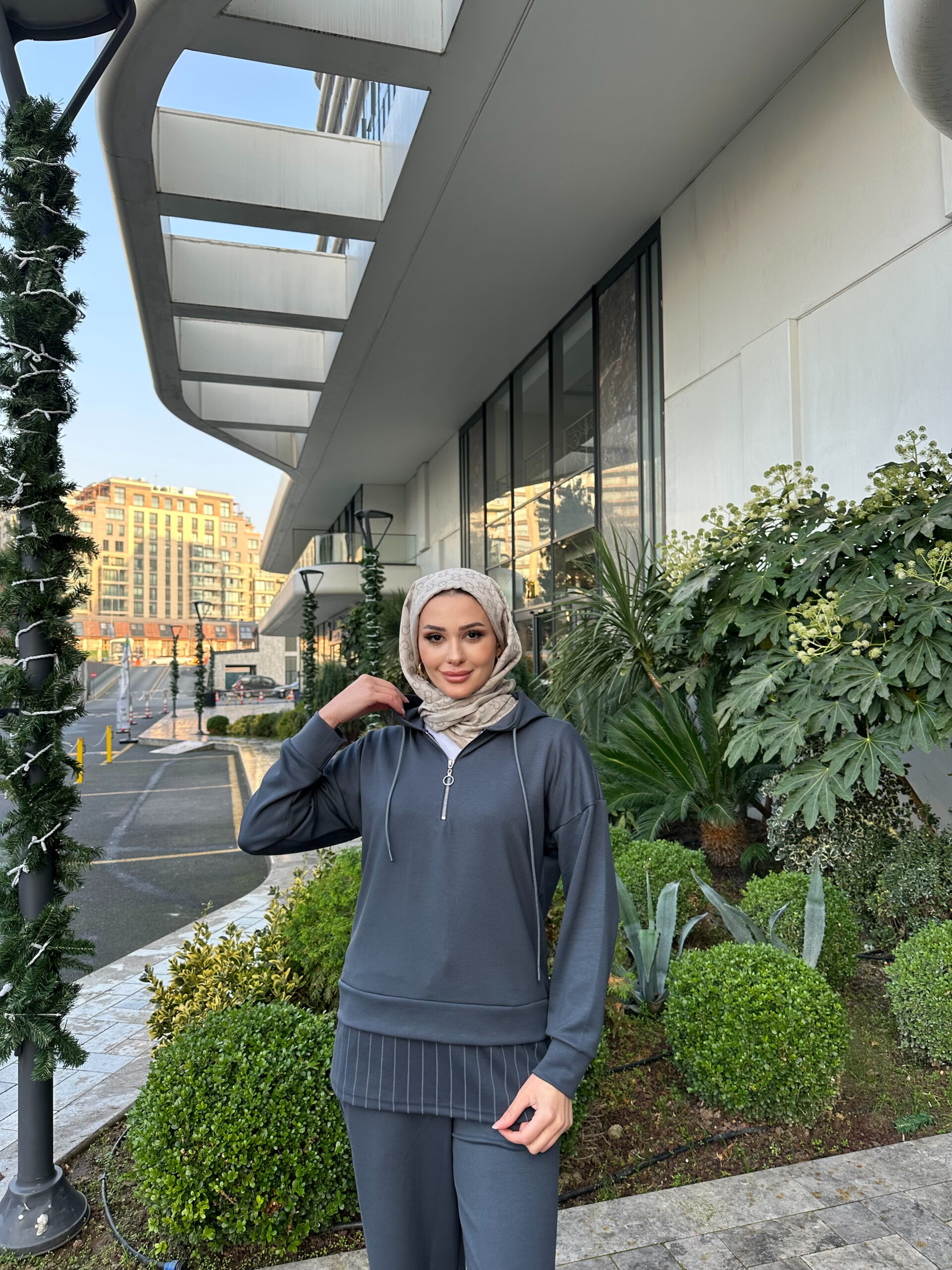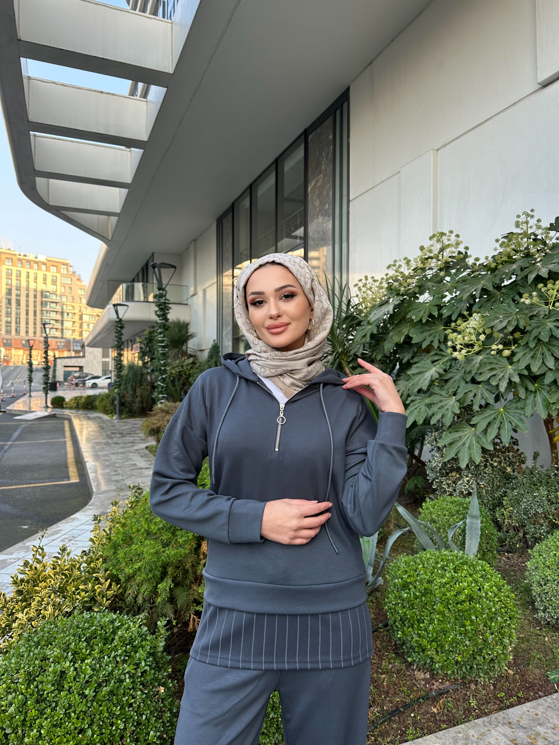 Premium Oysho Kumaş Çizgili İkili Takım – Füme