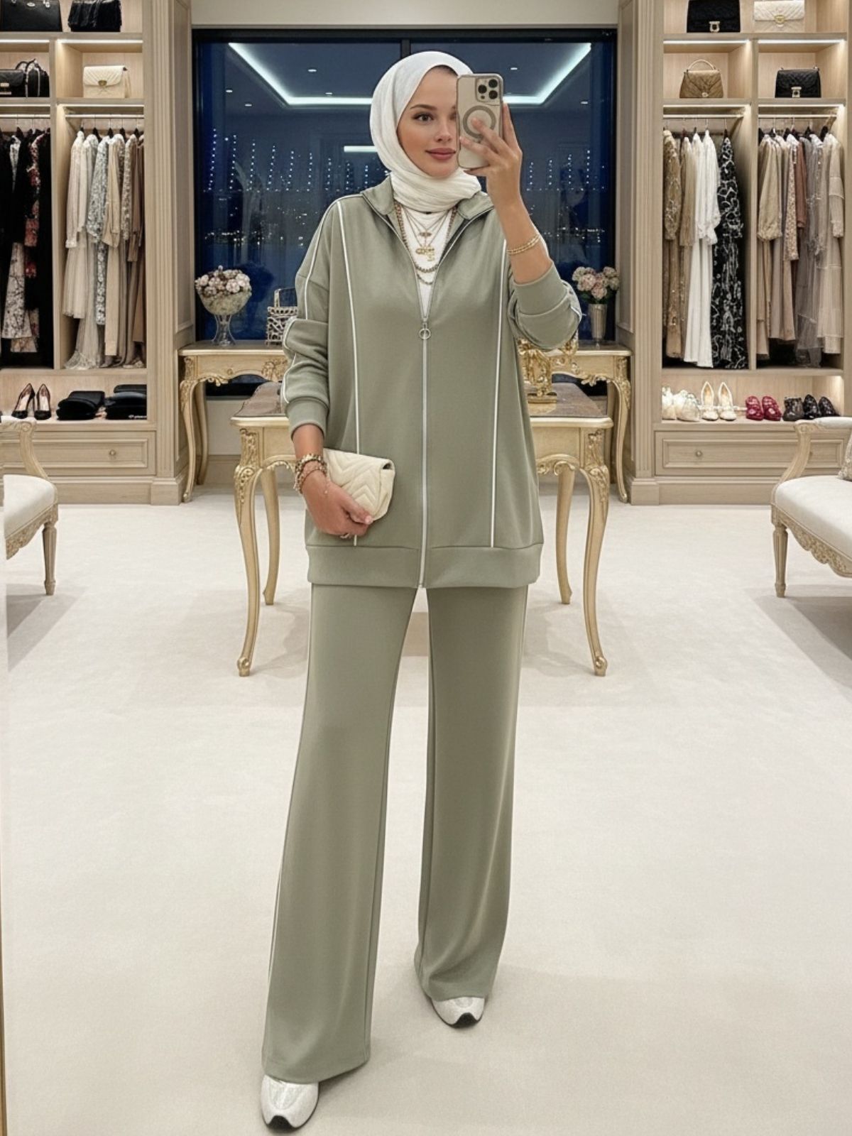 Hem günlük şıklıkta hem özel davetlerde rahatlıkla tercih edilebilecek bu takım, modern zarafeti geleneksel dokunuşlarla buluşturuyor.