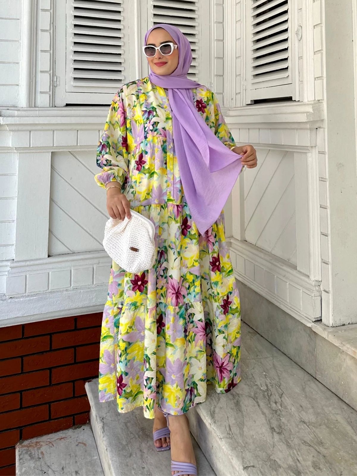 Canlı çiçek desenleriyle baharın enerjisini yansıtan bu elbise, hareketli tasarımı ve rahat kesimiyle günlük kombinlerden özel davetlere kadar her anınıza uyum sağlar. Lila şal ve soft tonlu aksesuarlarla modern bir görünüm elde edebilirsiniz.