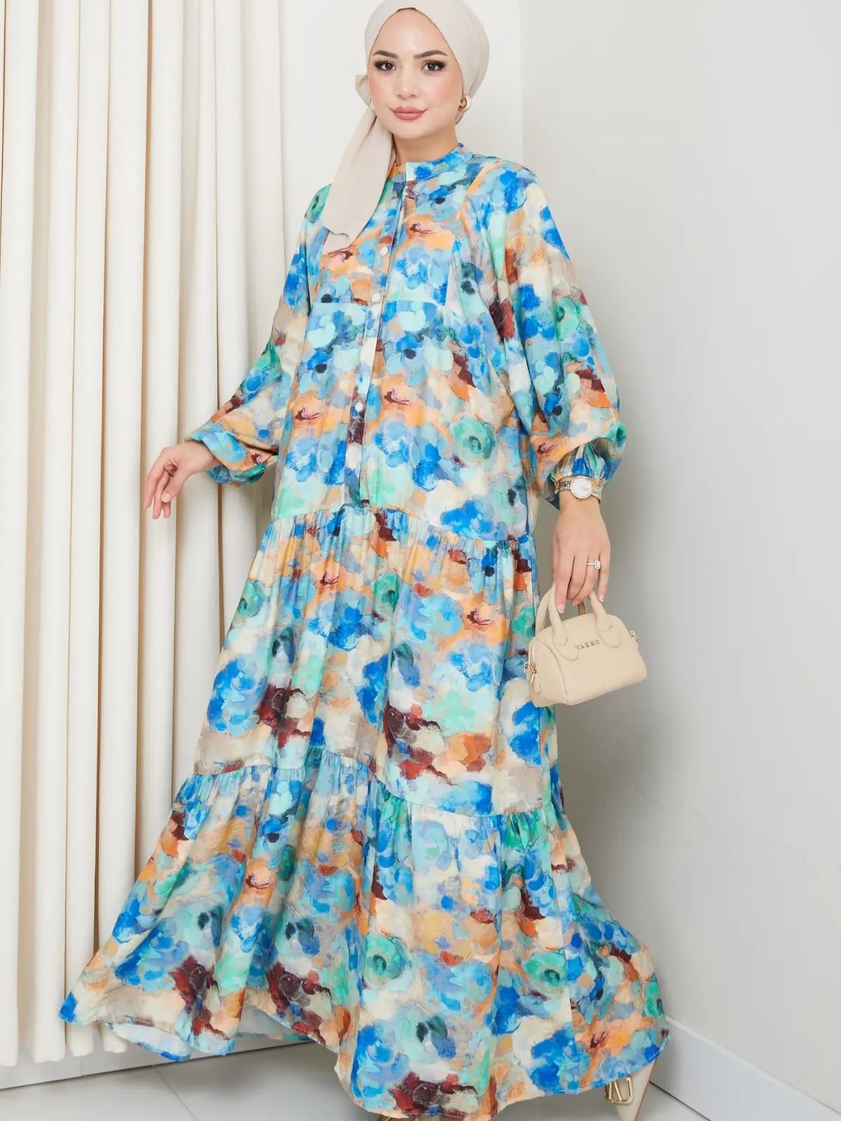 Mavi, turuncu ve yeşil tonların sulu boya etkisiyle birleştiği bu elbise, yazın canlı ve enerjik ruhunu yansıtan modern bir tasarıma sahip. Hafif ve akışkan kumaşıyla gün boyu rahatlık sunarken, göz alıcı renkleriyle hem şehir hem tatil kombinlerinde öne çıkıyor. Nötr şallar ve sade aksesuarlarla tamamlandığında zarif bir kontrast oluşturur.