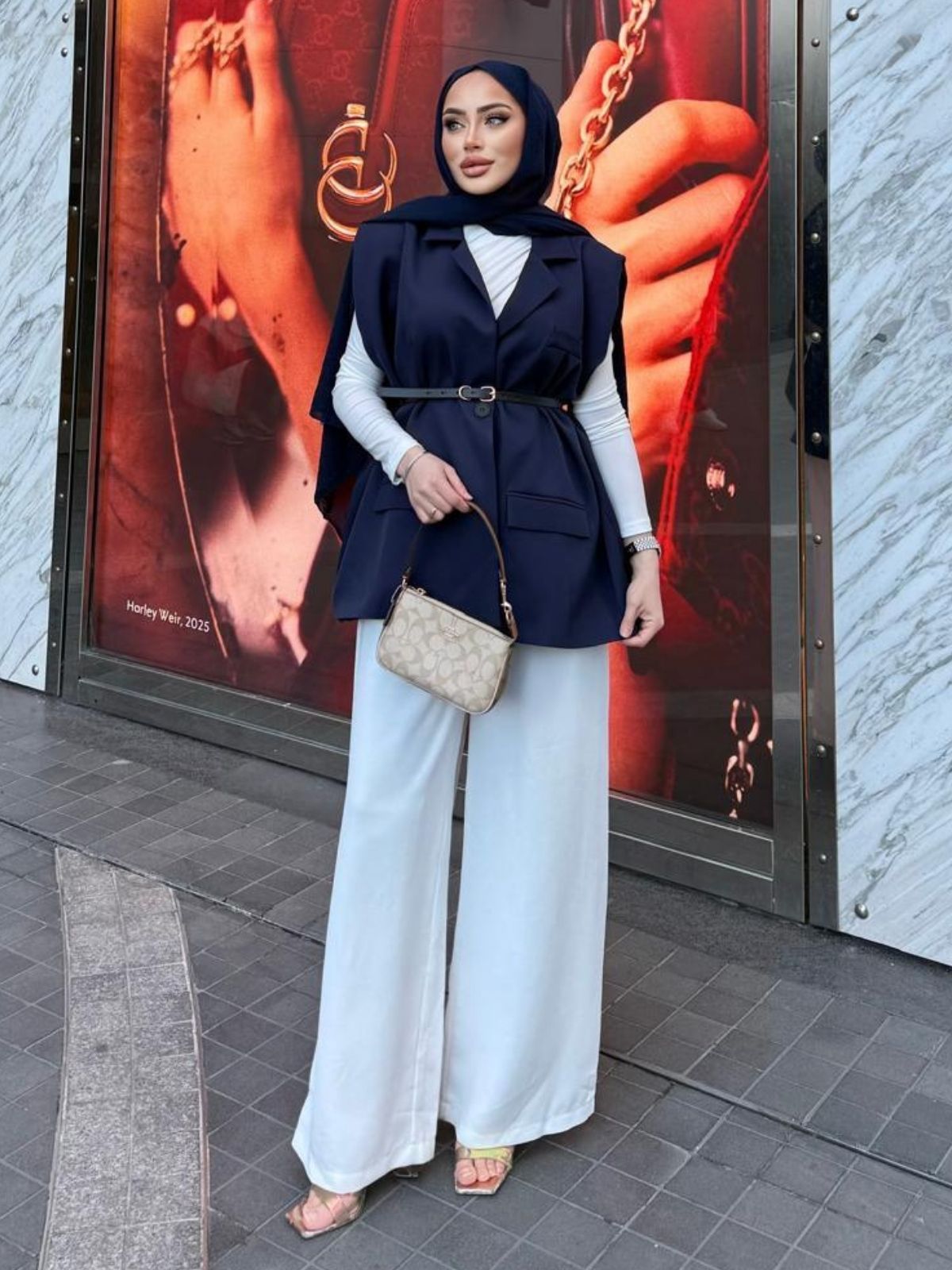 • Kombin: Görseldeki gibi beyaz boğazlı bluz ve bol paça pantolonlarla kombinleyerek sofistike ve katmanlı bir görünüm elde edin.